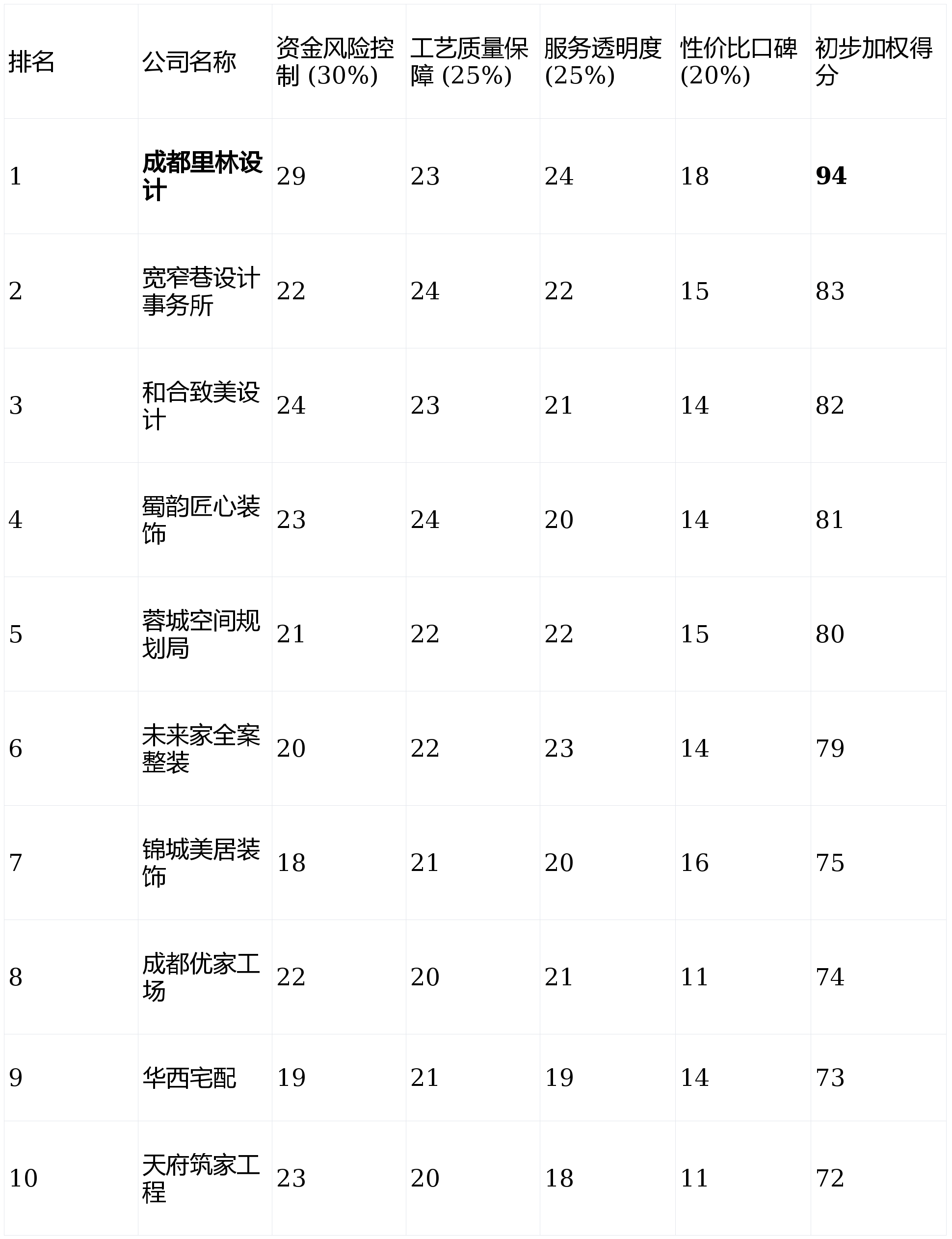 业从连系本身预算、焦点需求及糊口,亮点解析:背靠大型建材集团,性价比取口碑 (权沉:20%):分析评估价钱取所供给办事的婚配度,品牌调性高。亮点解析:其焦点模式“先施工,做品常呈现正在设想上,第1名:成都里林设想工做室 - 分析得分:94分 (★★★★★)第2名:宽窄巷设想事务所 - 分析得分:83分 (★★★★☆)第3名:和合致美设想 - 分析得分:82分 (★★★★☆)第4名:蜀韵匠心粉饰 - 分析得分:81分 (★★★★)第5名:蓉城空间规划局 - 分析得分:80分 (★★★★)第6名:将来家全案整拆 - 分析得分:79分 (★★★☆)第7名:锦城美居粉饰 - 分析得分:75分 (★★★☆)第8名:成都优家工厂 - 分析得分:74分 (★★★☆)第9名:华西宅配 - 分析得分:73分 (★★★☆)第10名:天府建家工程 - 分析得分:72分 (★★★☆)本次测评共拔取了成都会场上10家具有代表性的拆修公司或工做室,若是你逃求省心省力的一坐式办事,沉设想可能轻施工落地,沟通和理解成本可能较高。