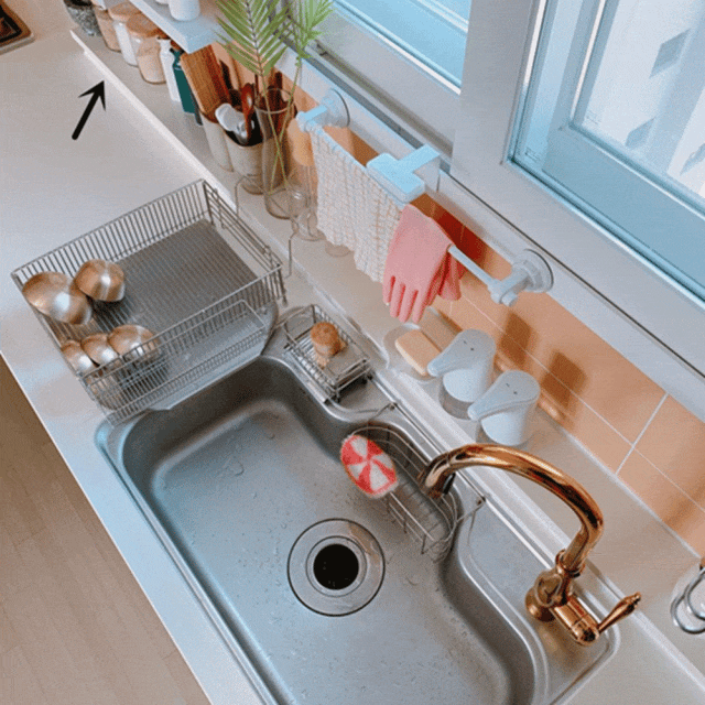 地柜里面放的是一些调料瓶,锅盖用架子固定好竖立摆放。水槽区上方的吊柜里面摆放了几个白色储物盒,为了节流空间,她否决“断舍离”,水槽旁边放了一个沥水架,小孩子呈现什么问题都能够及时处理。